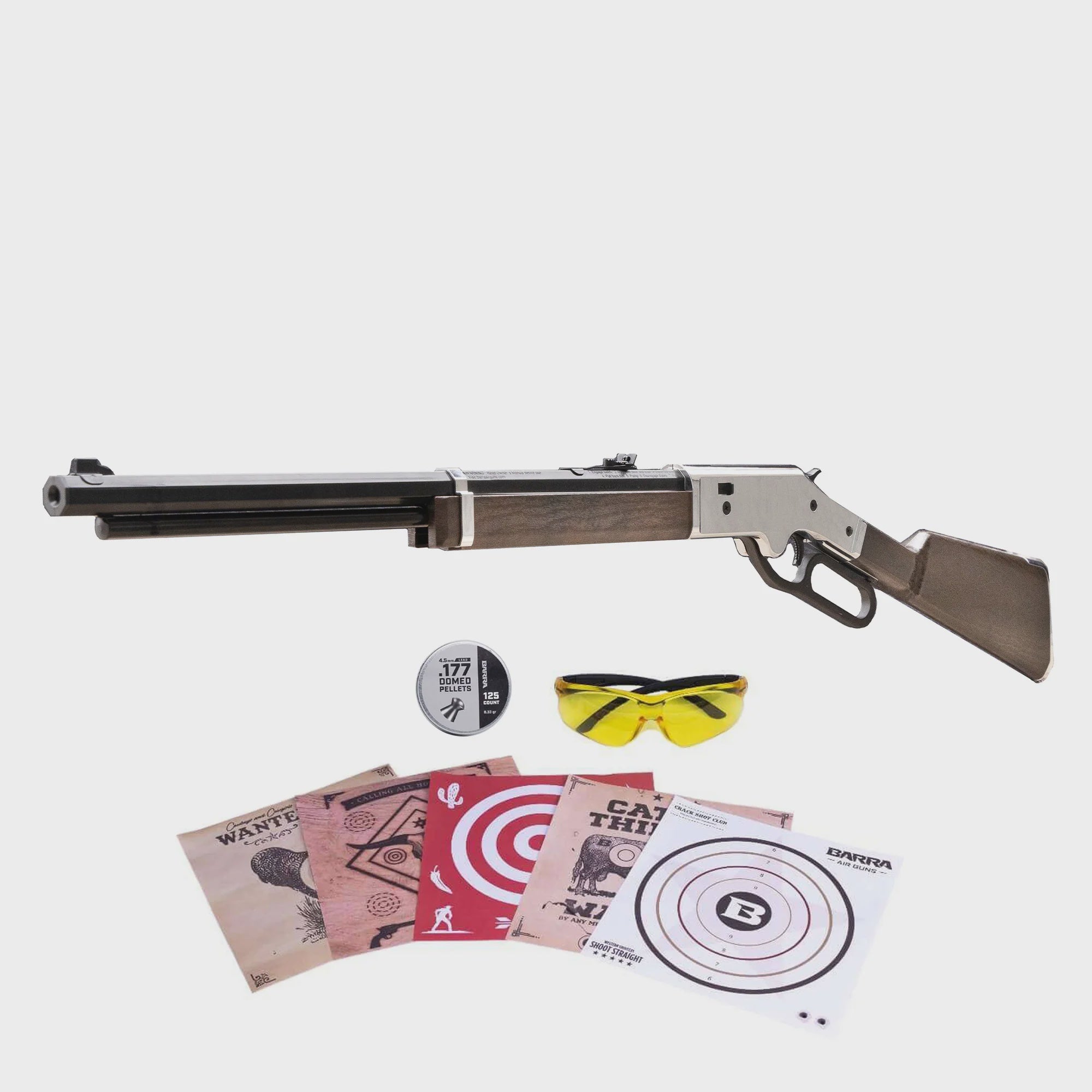 This kit includes a 125-count tin of .177 caliber pellets, safety shooting glasses, and five targets.